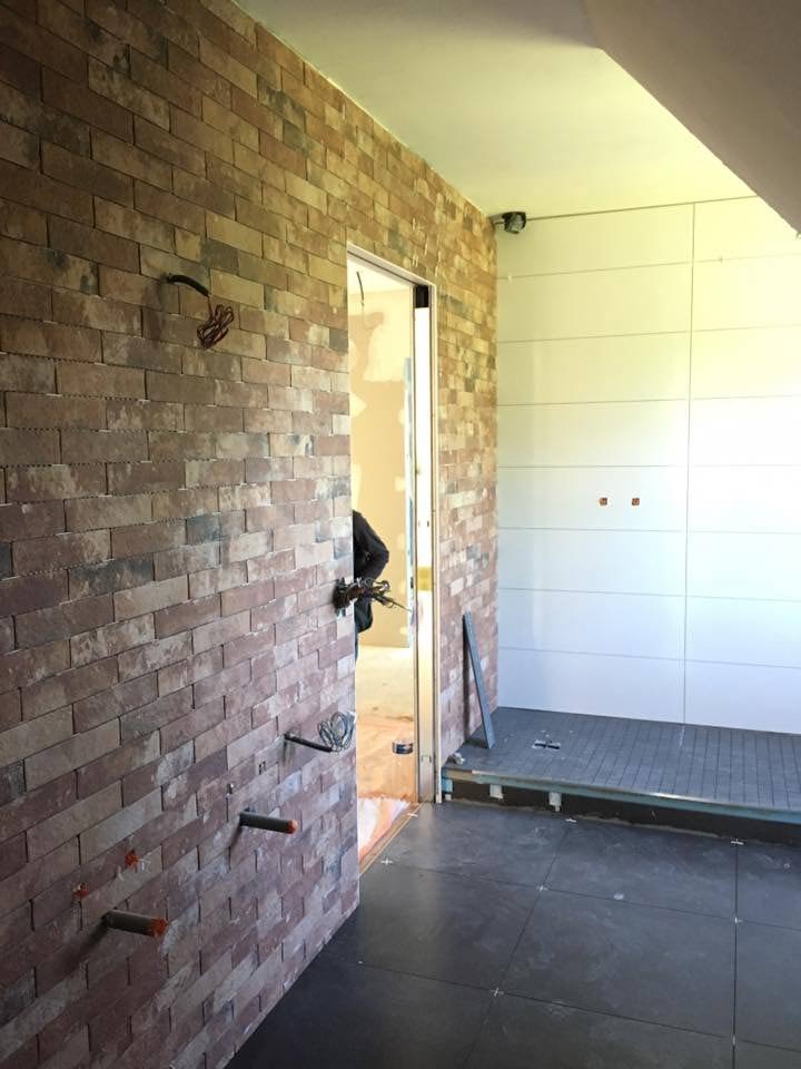 - Mur principal recouvert de briques de faïence effet terre cuite, pose à joints fins